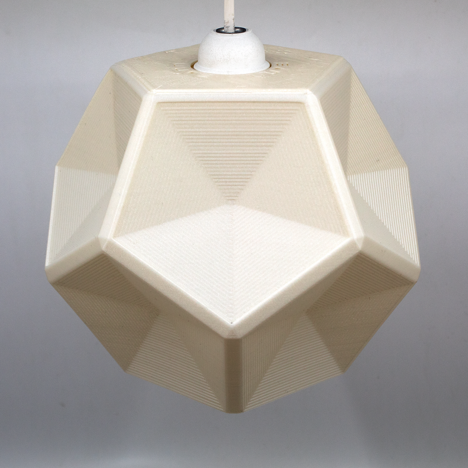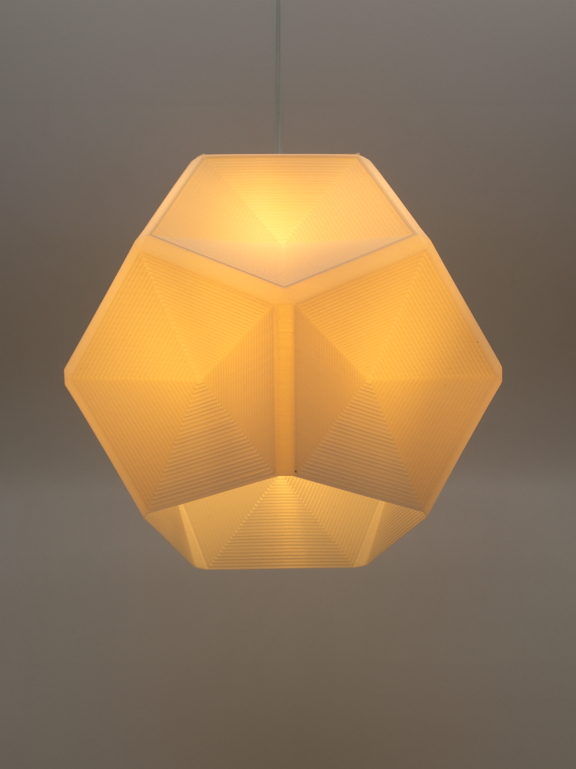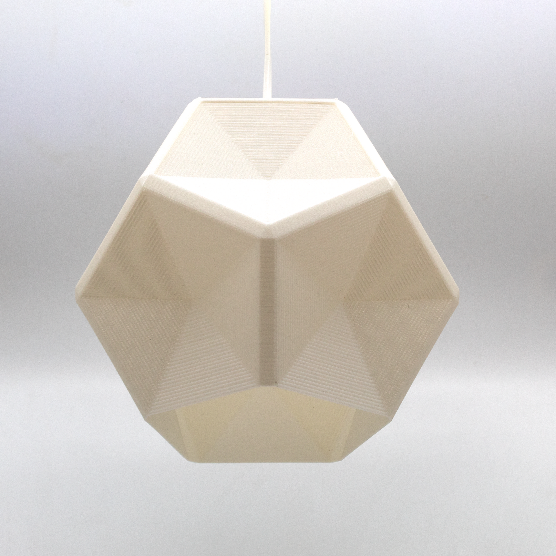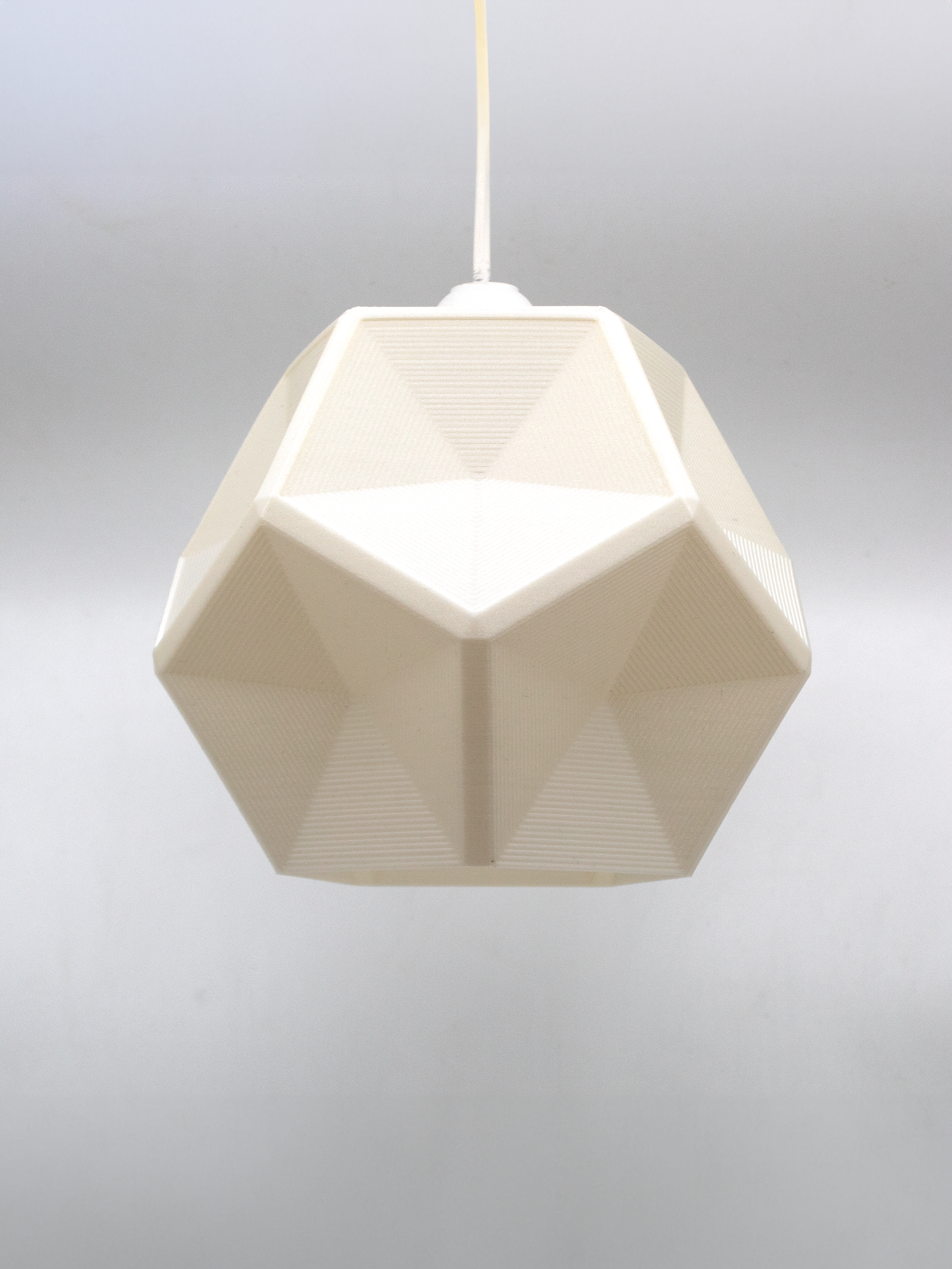 "Pende", from the creative workshop of 3D Print Project Athens, is a lampshade that transforms geometric precision and warm light into a work of art. This lampshade stands out for its multifaceted design, reminiscent of the shape of a dodecahedron and paying homage to the Platonic solids. "Pende", which means "five" in Greek, reflects the pentagonal facets that together form this unique lampshade.