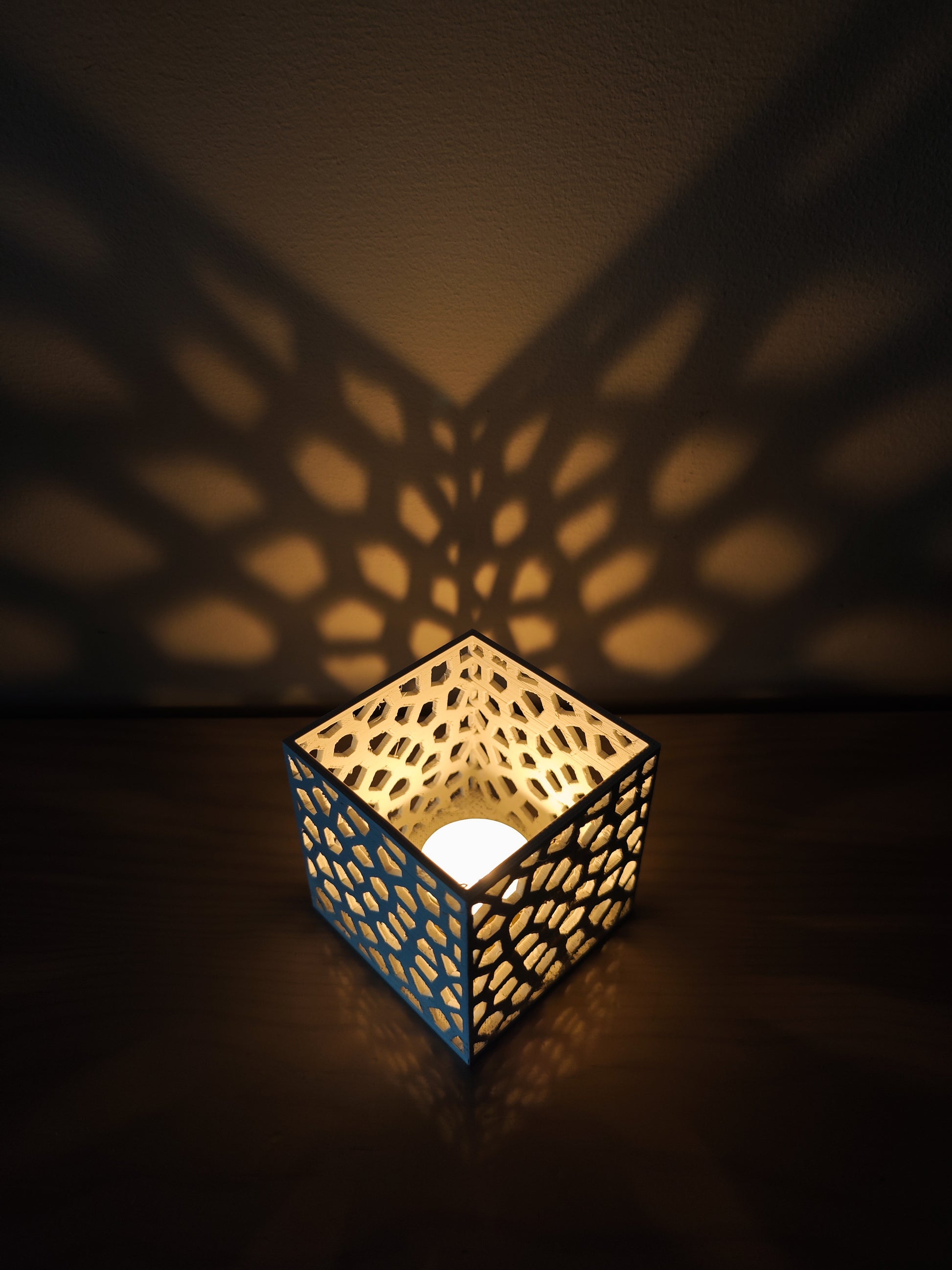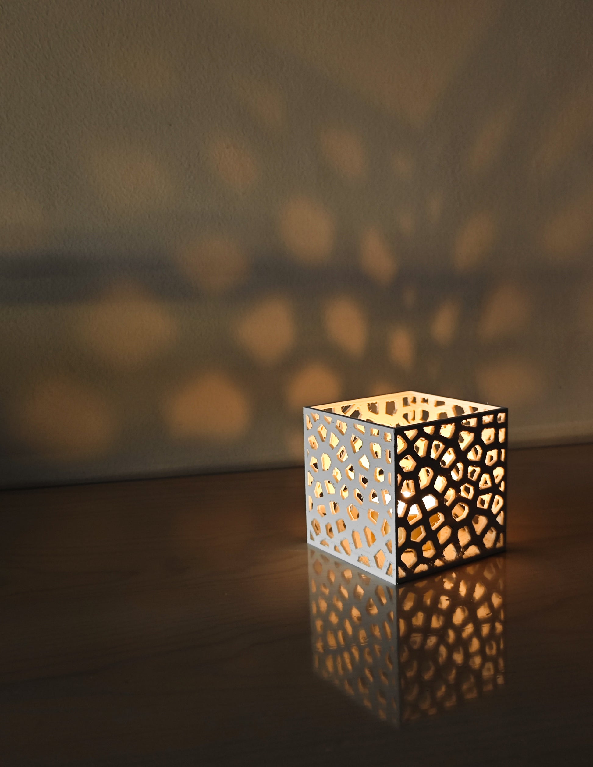 When a candle is lit in the "Celulacube", the full potential of its design is revealed: the light dances through the numerous openings and creates a dynamic, organic-looking pattern of light and shadow that spreads across the surrounding space. This effect not only enchants the senses, but also creates a calming, relaxed atmosphere that invites you to pause and enjoy.