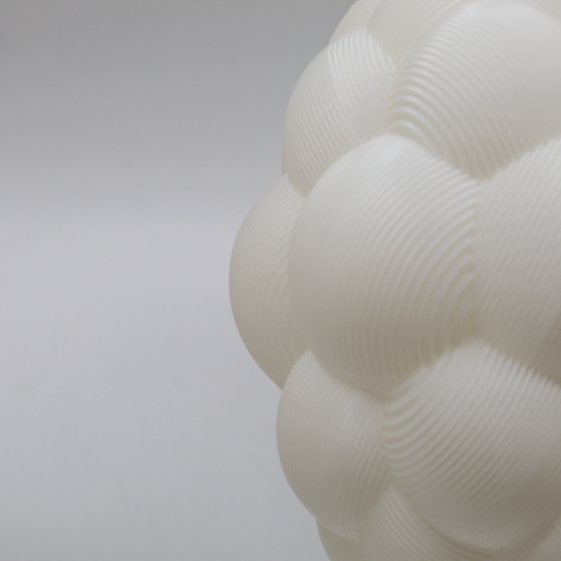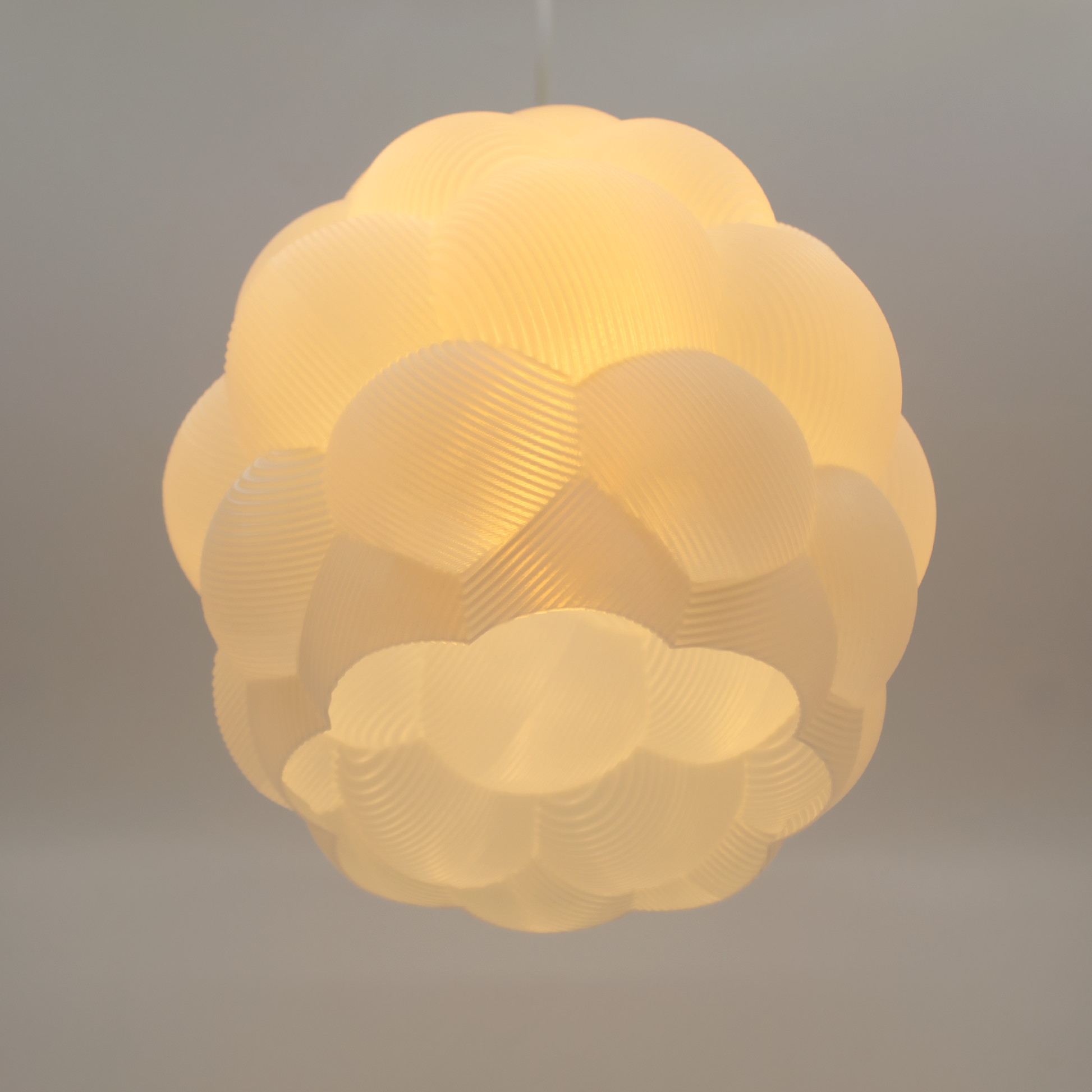 L'abat-jour est composé de plusieurs couches de matériau biodégradable disposées selon des formes douces et arrondies pour diffuser harmonieusement la lumière. La technologie d’impression 3D permet de créer des motifs précis et cohérents qui captent la lumière et projettent une lueur enchanteresse dans la pièce.